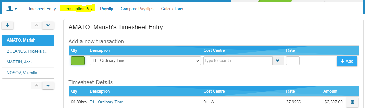 - If the termination pay is to be made after your normal pay day, process and confirm your normal payroll as usual. Then open a one-off payroll to calculate the termination pay.